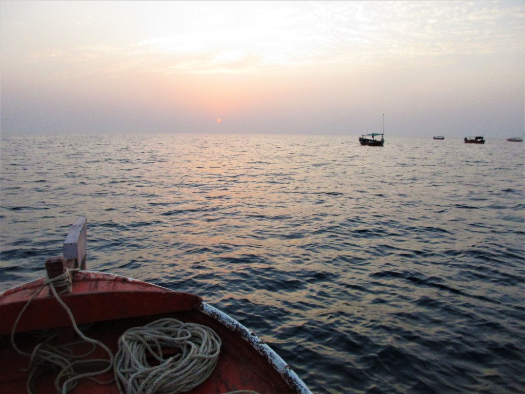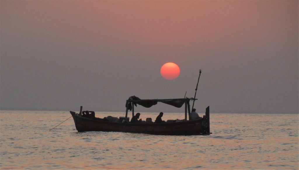 We started our journey from Sunhera Beach, we took small boat put all necessary equipment including battery, extra fuel and food for one night/breakfast. Sea water was calm there was no any prediction of high tides in ocean. Boat was moving slow and calm on waves after reaching our first destination we put our boat anchor down, started thronging hooks for first catch. By the end of afternoon we couldn’t find any good catch except two small fishes. Our captain of the boat decided to move the boat from north to west for new destination.